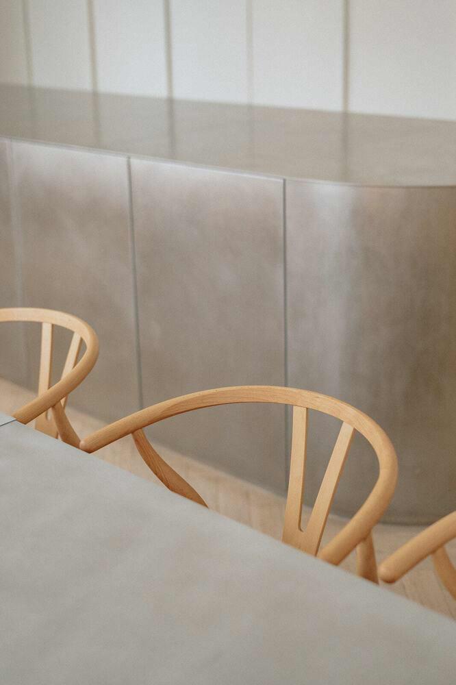 In onze centrale ruimte schuiven 20 iconische CH24 Wishbone-stoelen van Carl Hansen & Son moeiteloos onder een reeks elegante inox tafels. Een ontwerp geïnspireerd op het werk van Gents designicoon Maarten Van Severen, met oog voor eenvoud, materiaal en lijnenspel.