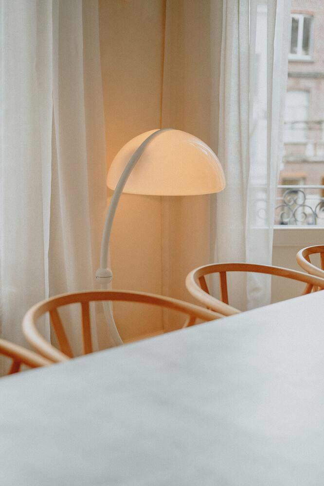 De verlichting is zorgvuldig gecureerd, de kunstwerken en designobjecten met aandacht gekozen. Denk aan een huiselijke mix van vintage vondsten en hedendaagse flair—een interieur waar iconen van Achille en Pier Giacomo Castiglioni naadloos communiceren met serveerschalen die we erfden van onze ‘Marraine’. Even tijdloos. Even iconisch.
