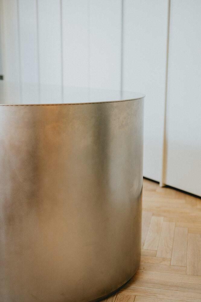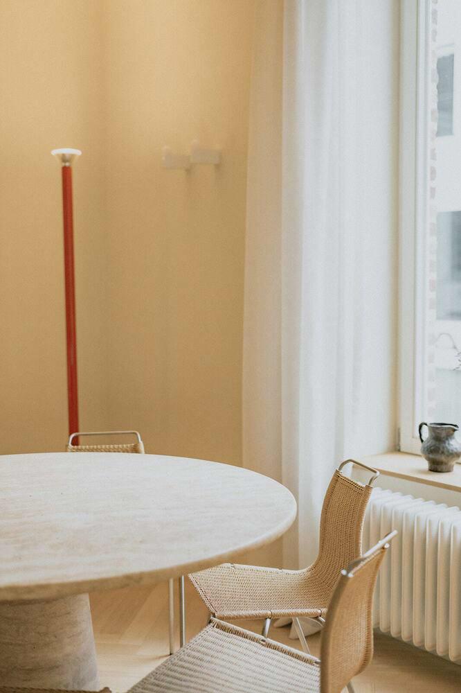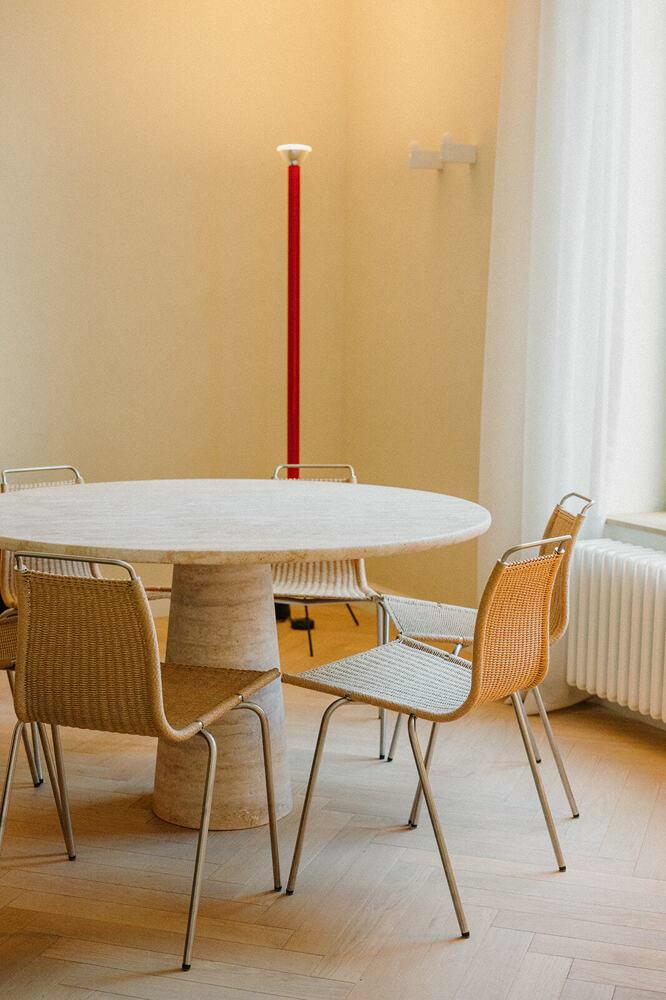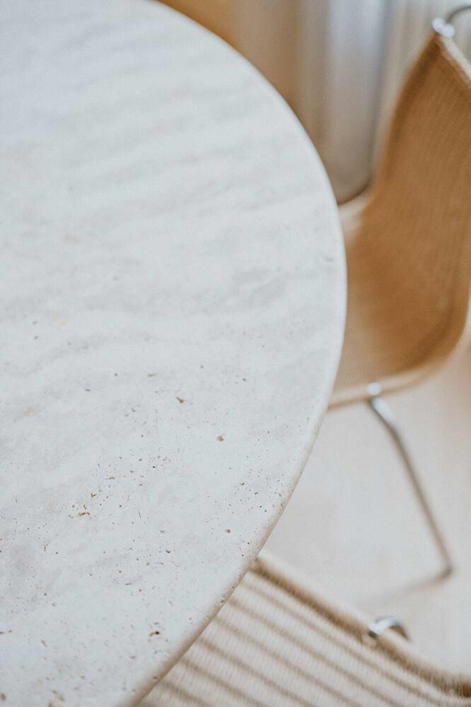 Voor meer intieme momenten is er de ronde, vintage travertin tafel — een vondst uit Parijs — waaraan acht PK1 dining chairs van Poul Kjærholm hun plek vinden. Deze stoelen spreken dezelfde esthetische taal als het appartement: een zorgvuldige balans tussen ruwe, natuurlijke materialen en verfijnde, moderne lijnen.